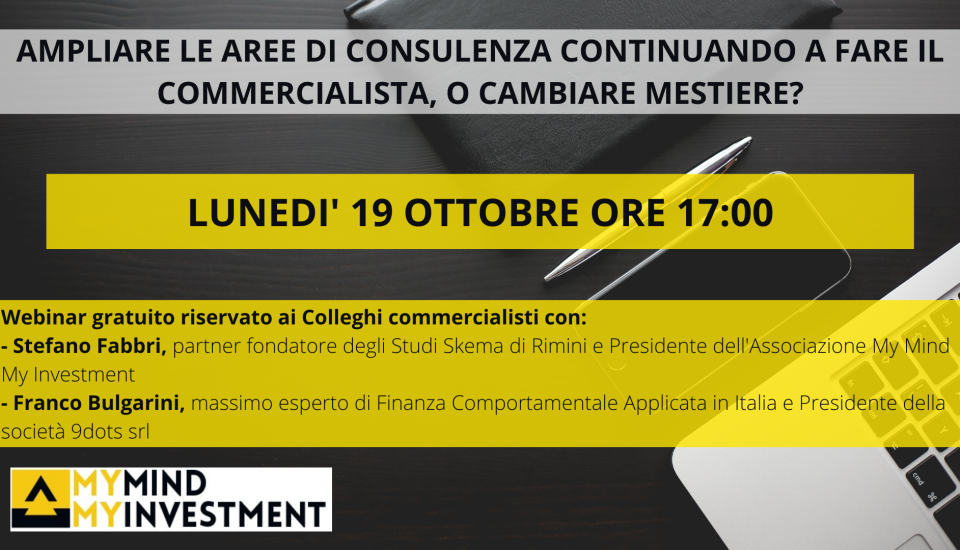 “FINALMENTE IL COMMERCIALISTA TORNA PROTAGONISTA. TUTELA E ASSISTENZA AGLI INVESTITORI“ Giovedì 11 marzo 2021 dalle 17.00 alle 18.00 Webinar gratuito riservato ai Colleghi commercialisti con: – Stefano Fabbri, partner co-fondatore degli Studi Skema di Rimini e Presidente dell’Associazione My Mind My […]